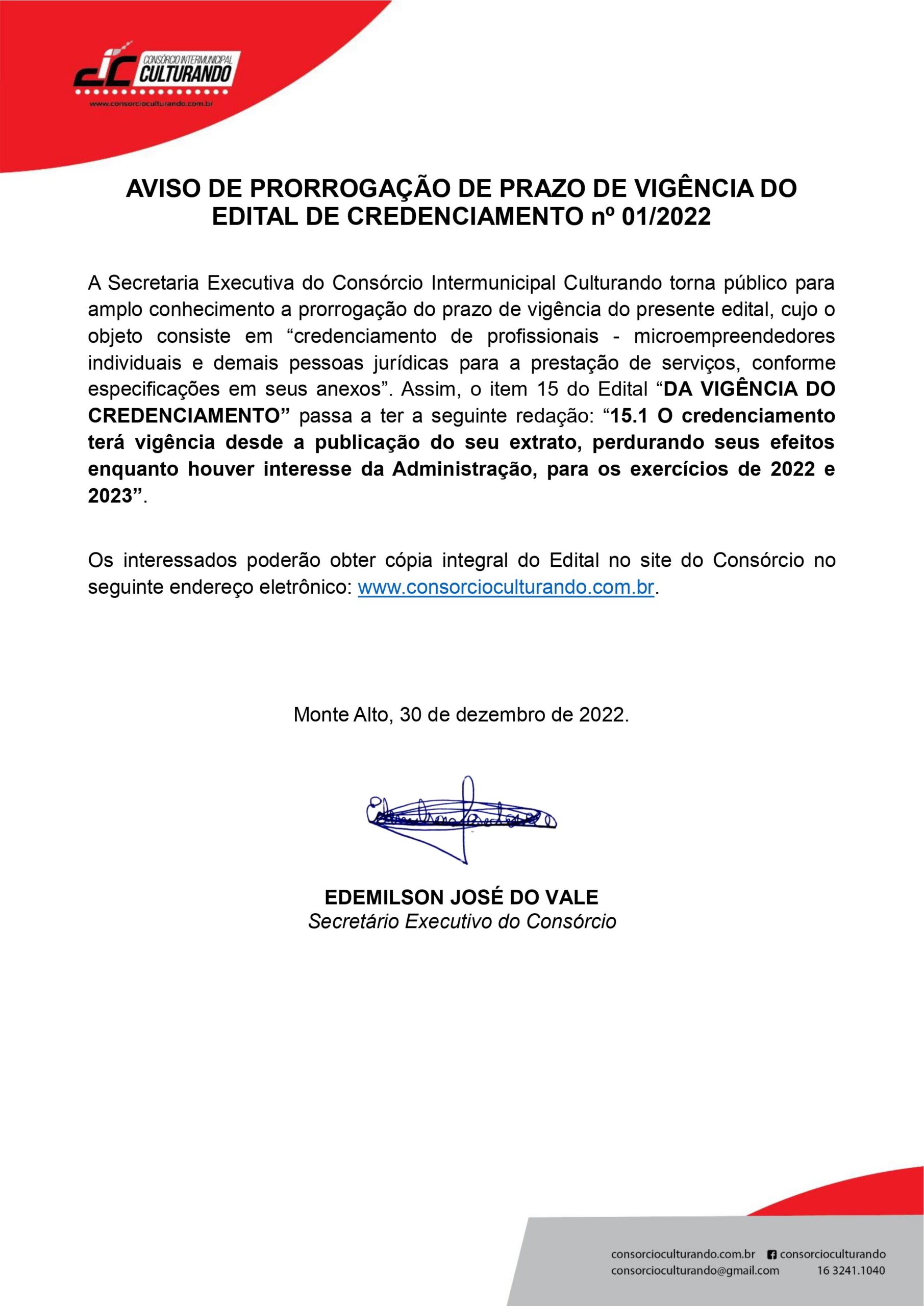 AVISO DE PRORROGAÇÃO DE PRAZO DE VIGÊNCIA DO EDITAL DE CREDENCIAMENTO nº 01/2022