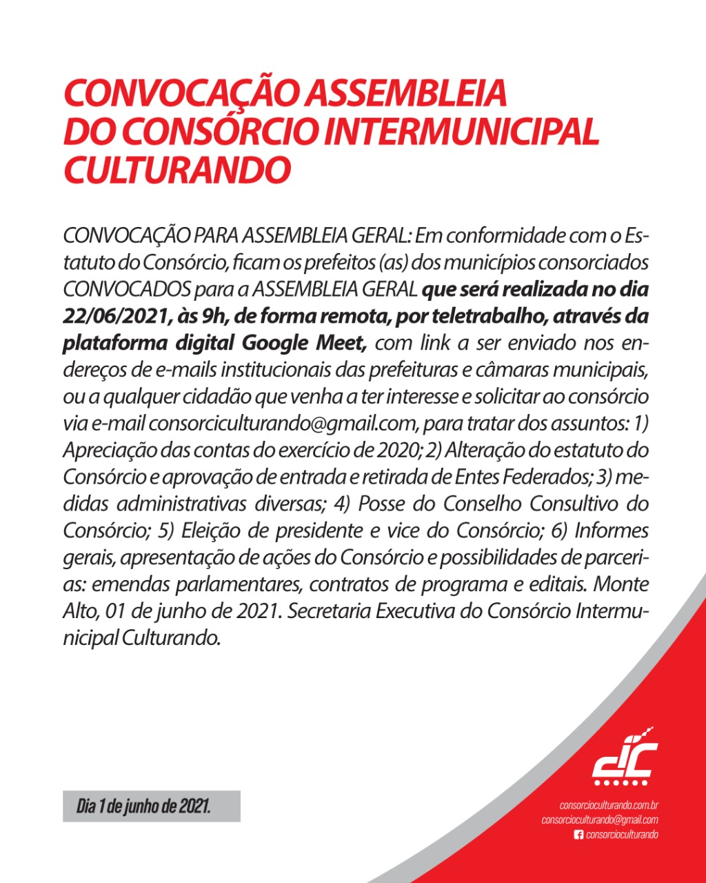 Convocação Assembleia do Consórcio Intermunicipal Culturando