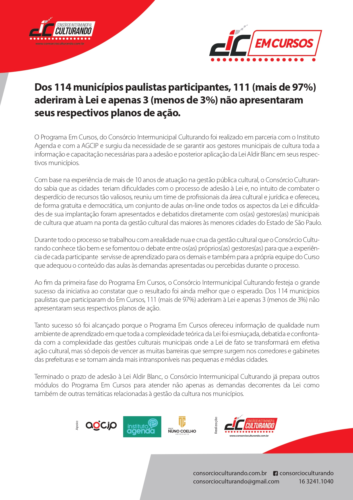 Início » Notícias » Dos 114 municípios paulistas participantes, 111 (mais de 97%) aderiram à Lei e apenas 3 (menos de 3%) não apresentaram seus respectivos planos de ação.