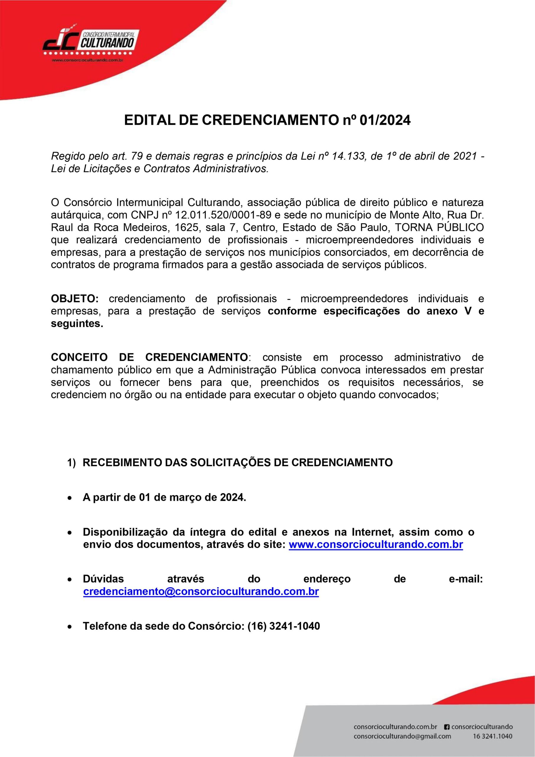 Regido pelo art. 79 e demais regras e princípios da Lei nº 14.133, de 1º de abril de 2021 – Lei de Licitações e Contratos Administrativos. O Consórcio Intermunicipal Culturando TORNA PÚBLICO que realizará credenciamento de profissionais – microempreendedores individuais e empresas, para a prestação de serviços nos municípios consorciados, em decorrência de contratos de programa firmados para a gestão associada de serviços públicos.