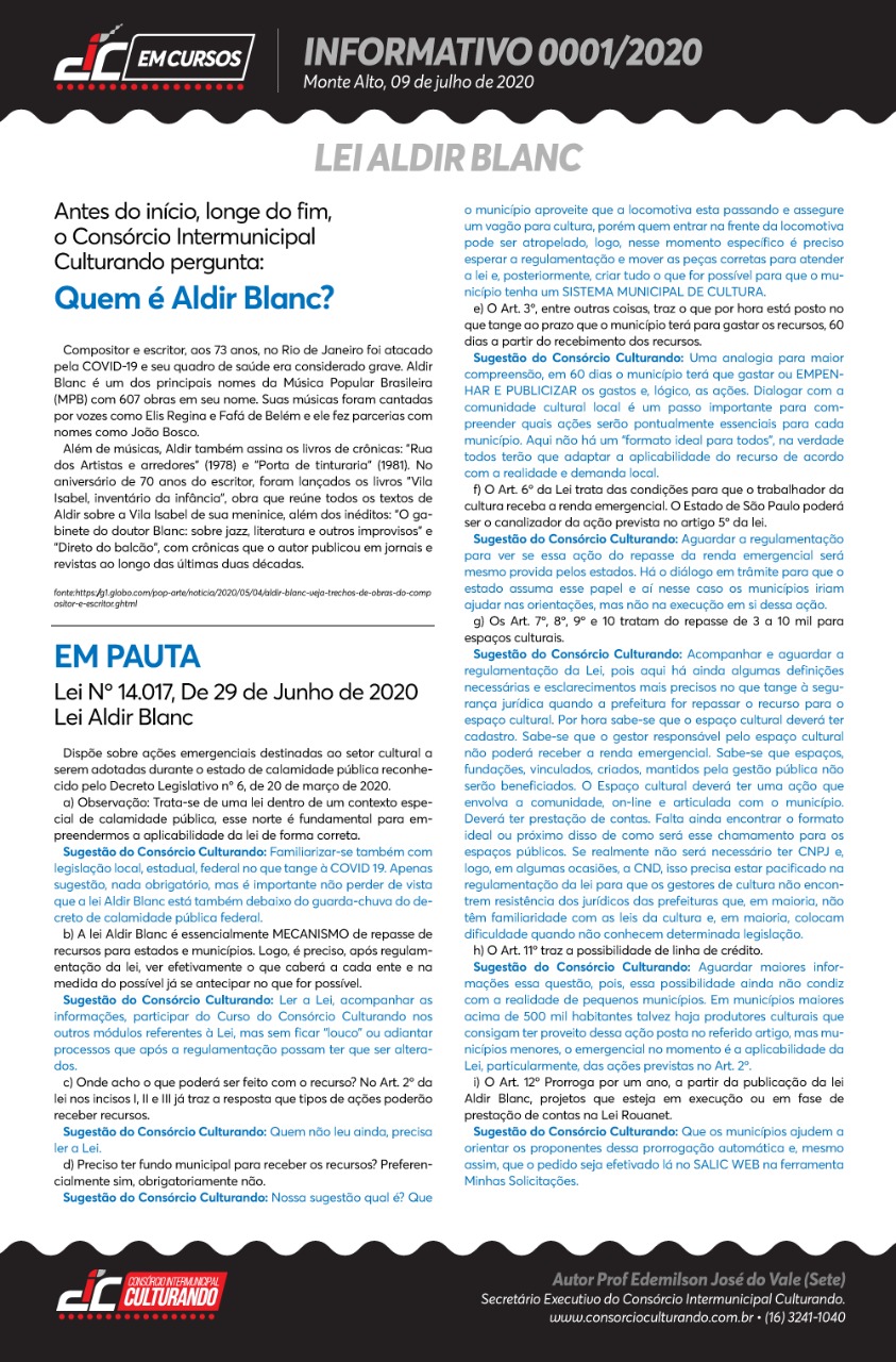 INFORMATIVO 001/2020 – LEI ALDIR BLANC